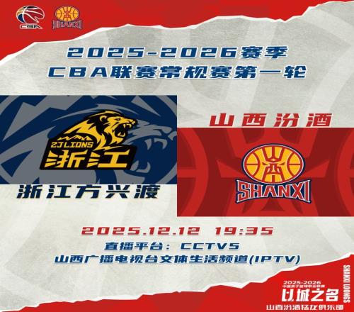 北京時(shí)間2025年12月12日19:35,山西汾酒男籃迎來(lái)2025-2026賽季CBA聯(lián)賽揭幕戰(zhàn),客場(chǎng)挑戰(zhàn)上賽季冠軍浙江方興渡。球迷觀眾可以通過(guò)CCTV5、山西廣播電視臺(tái)文體生活頻道(IPTV)觀看比賽實(shí)況,敬請(qǐng)期待!